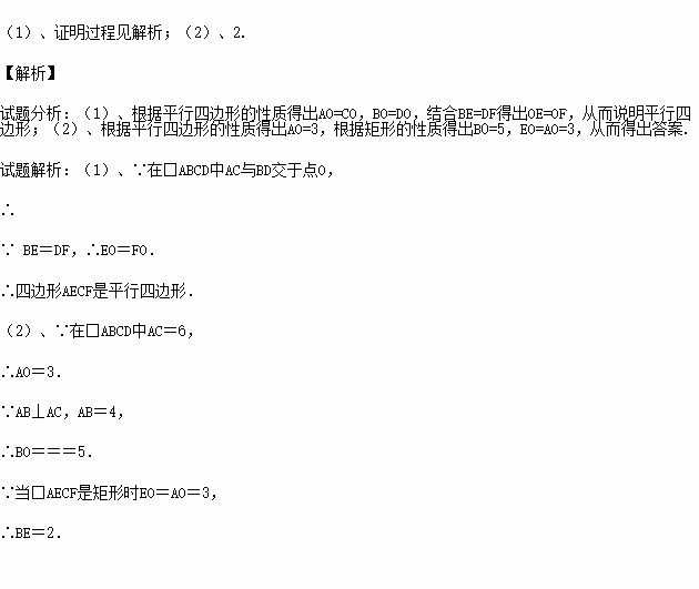 (2)若AB⊥AC,AB=4,AC=6,当□AECF是矩形时,求BE的长.