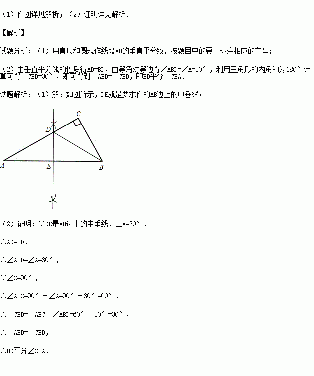 (1)用尺规作图作AB边上的中垂线DE,交AC于点D,交AB于点E.(保留作图痕迹,不要求写作法和证明);