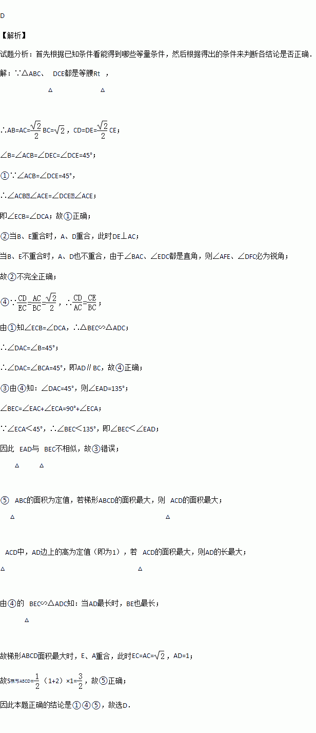 如图,△ABC为等腰直角三角形,∠BAC=90°,BC=2,E为AB上任意一动点,以CE为斜边作等腰Rt△CDE,连接AD,下列说法:①∠BCE=∠ACD;②AC⊥ED;③△AED∽△ECB;④AD∥BC;⑤四边形ABCD的面积有最大值,且最大值为