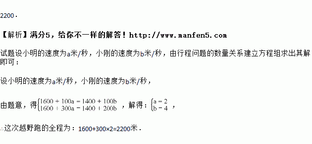 一次越野跑中,当小明跑了1600米时,小刚跑了1400米,小明、小刚在此后所跑的路程y(米)与时间t(秒)之间的函数关系如图所示,则这次越野跑的全程为 米