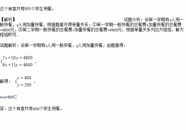 学校每天中午为学生提供两种快餐,第一种一般快餐每盒7元,第二种加量快餐是在第一种快餐基础上加一些食物,因此每盒加收3元,第一学期的一天中午共收到餐费4800元,第二学期一般快餐每盒降价1元,加量快餐每盒涨价1元,因此一天中午共收到餐费4600元,求这个食堂共有多少学生用餐。