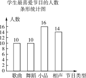 【题目】某学校要开展校园文化艺术节活动,为了合理编排节目,对学生最喜爱的歌曲、舞蹈、小品、相声四类节目进行了一次抽样调查(每名学生必须选择且只能选择一类),并将调查结果绘制成如下不完整的统计图.