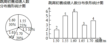分析 (1)由1.50的人数除以占的百分比求出总人数,进而确定出初赛成绩为1.65m所在扇形图形的圆心角即可;