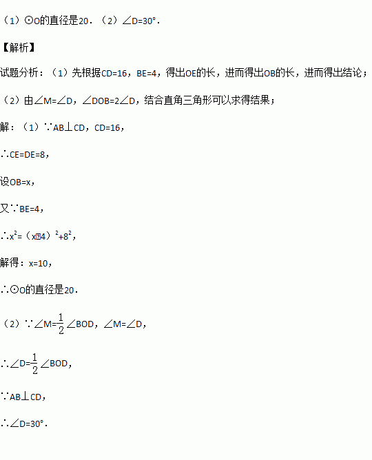 (1)若CD=16,BE=4,求⊙O的直径;