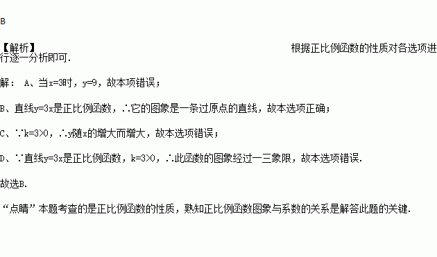 下列关于正比例函数y = 3x的说法中,正确的是( )