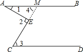 解答 解:延长CE交AB于M,∵AB∥CD,∴∠4=∠3,∵∠1+∠4=∠2=90°,∴∠1+∠3=90°,∴∠1和∠3互余,故答案为:互余.