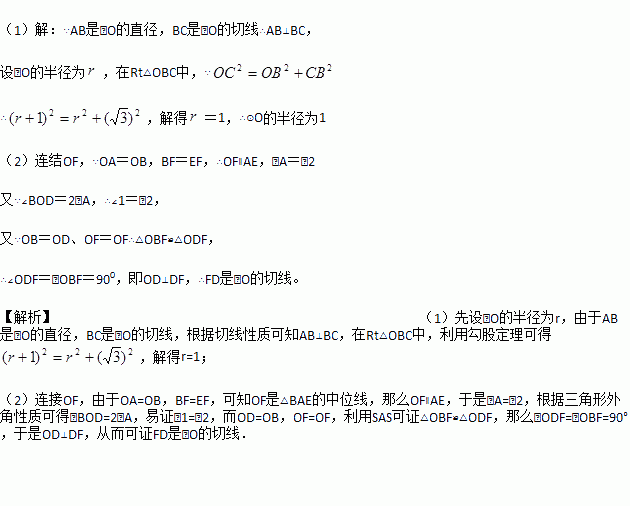 (2)取BE的中点F,连结DF,求证:DF是⊙O的切线。