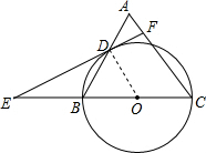 分析:先连接OD,由于AC=BC,易得∠A=∠ABC,而OD=OB,又能得到∠OBD=∠ODB,等量代换可得∠ODB=∠A,利用同位角相等两直线平行可知OD∥AC,而DF⊥AC,那么∠CFD=90°,利用平行线性质可得∠ODE=90°,可证EF是⊙O的切线.