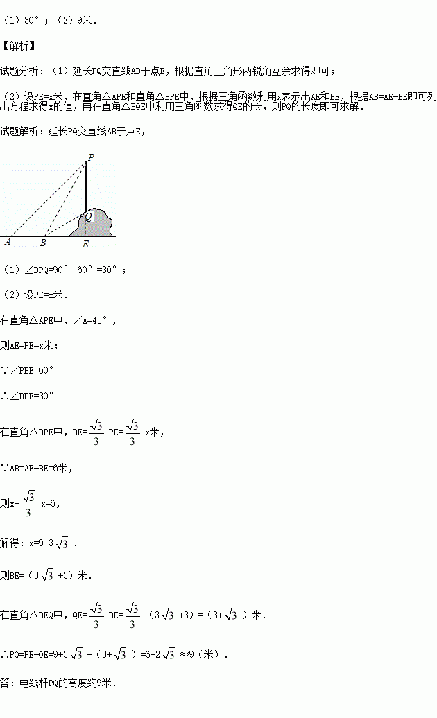 如图,从地面上的点A看一山坡上的电线杆PQ,测得杆顶端点P的仰角是45°,向前走6m到达B点,测得杆顶端点P和杆底端点Q的仰角分别是60°和30°.