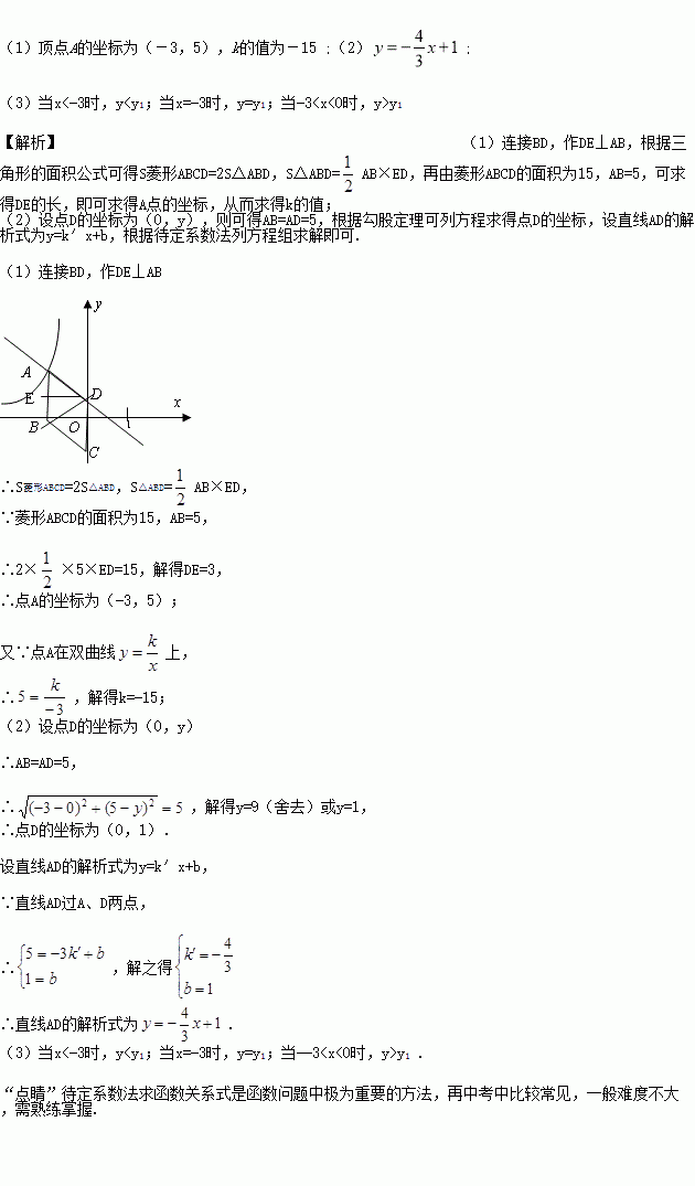 如图,在直角坐标系中,已知菱形ABCD的面积为15,顶点A在双曲线