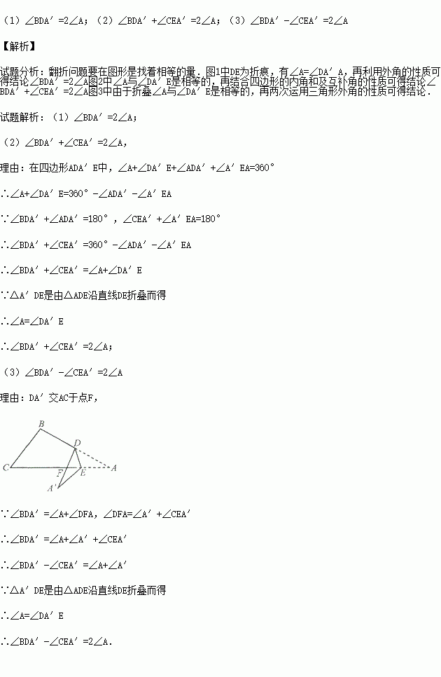 研究(3):如果折成图3的形状,猜想∠BDA′、∠CEA′和∠A的关系,并说明理由.