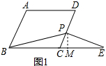 分析 (1)作PM⊥BE于M,则∠PMC=90°,由平行四边形的性质得出BC=AD,∠BCD=∠A=120°,证出∠CPM=30°,由含30°角的直角三角形的性质得出PC=2CM,由等腰三角形的性质得出BM=EM,得出BC=CE-CM-CM=CE-PC即可;