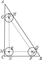 分析:如图,根据勾股定理的逆定理可证明△ACB为直角三角形,由于⊙D、⊙E和⊙F为半径为1的圆,且分别与△ABC的各边相切,根据切线的性质可得到DE∥AC,EF∥BC,DF∥AB,则△DEF∽△ABC,所以EF:DE:DF=3:4:5,设EF=3x,则DE=4x,DF=5x,所以GM=4x,NP=3x,HQ=5x,设AG=a,BP=b,根据切线长定理得AH=a,BQ=b,利用三角形三边的长得到