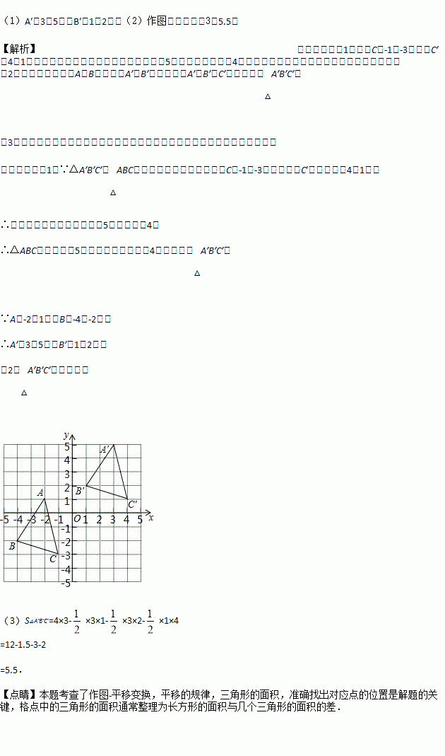 如图,△ABC中,A(﹣2,1)、B(﹣4,﹣2)、C(﹣1,﹣3),△A′B′C′是△ABC平移之后得到的图象,并且C的对应点C′的坐标为(4,1)