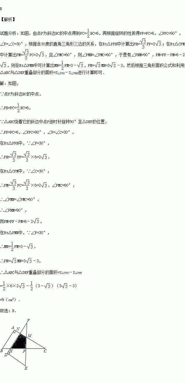 (2015秋•芜湖期末)如图,△ABC中,∠A=90°,∠C=30°,BC=12cm,把△ABC绕着它的斜边中点P逆时针旋转90°至△DEF的位置,DF交BC于点H.△ABC与△DEF重叠部分的面积为( )cm2.