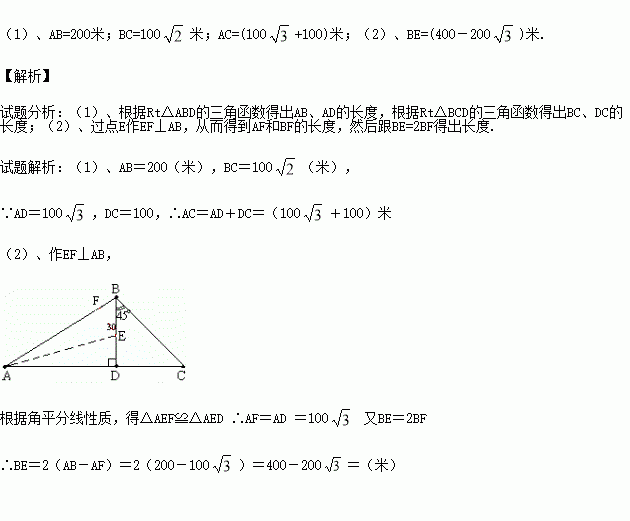 某公园有一座雕塑D,在北门B的正南方向,BD为100米,小树林A在北门的南偏西60°方向,荷花池C在北门B的东南方向,已知A,D,C三点在同一条直线上且BD⊥AC: