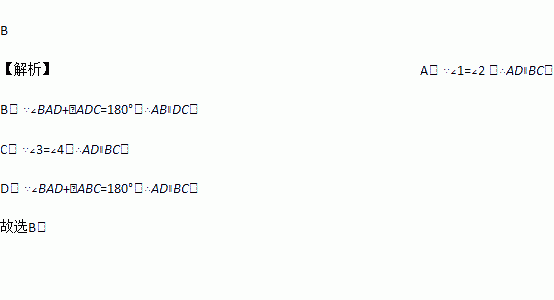 A. ∠1=∠2 B. ∠BAD+∠ADC=180° C. ∠3=∠4
