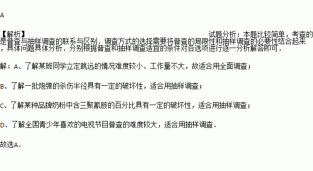 A. 了解某班同学立定跳远的情况 B. 了解一批炮弹的杀伤半径