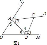 如图2,∵∠2=∠ACB+∠3,∠NAB=α+∠3+∠4,AD平分∠BAN,BC平分∠ABO,