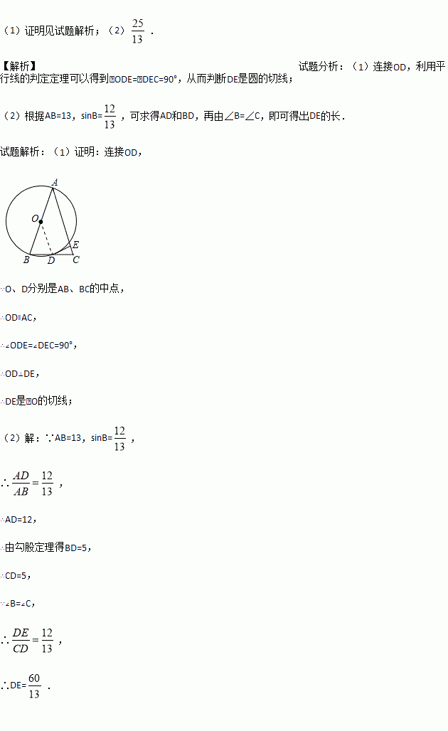 如图,△ABC中,AB=AC,以边AB为直径作⊙O,交BC于点D,过D作DE⊥AC于点E.