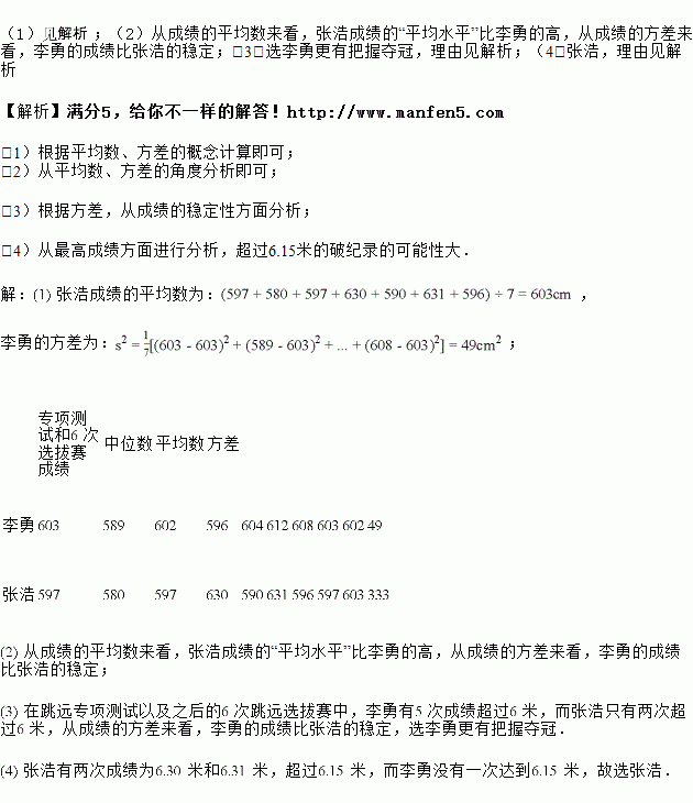 某校要从新入学的两名体育特长生李勇、张浩中挑选一人参加校际跳远比赛,在跳远专项测试以及以后的次跳远选拔赛中,他们的成绩(单位:![]()