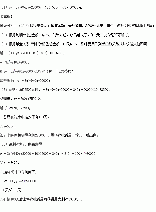 某特色农产品在市场上颇具竞争力,上市时,赵经理按市场价格10元/千克在某地收购了2000千克农产品存放入冷库中,据预测,农产品的市场价格每天每千克将上涨0.5元,但冷库存放这种农产品时每天需要支出各种费用合计340元,而且该产品在冷库中最多保存110天,同时,平均每天有6千克的产品损坏不能出售.