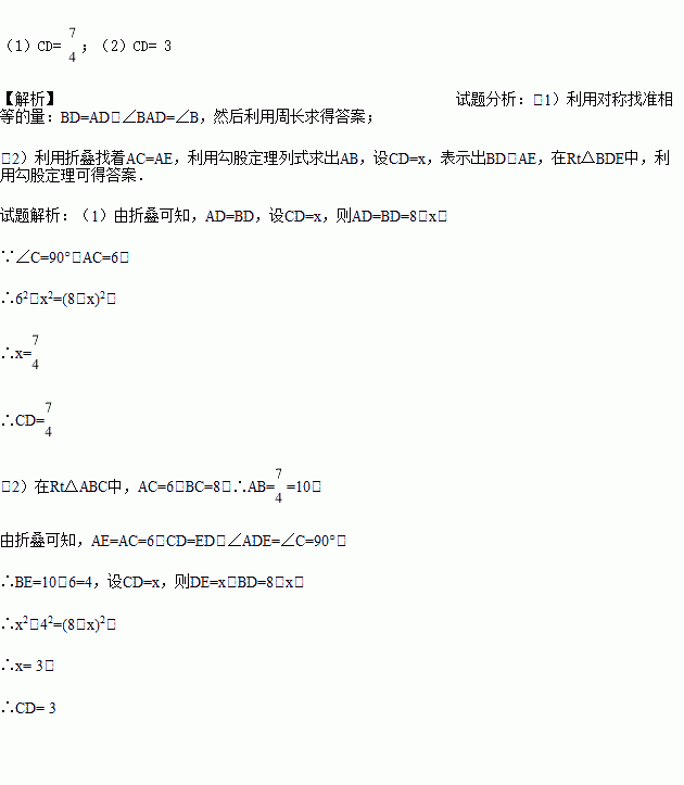 (2)如图2,小王拿出另一张Rt△ABC纸片,将直角边AC沿直线AD折叠,使它落在斜边AB上,且与AE重合,若AC=6cm,BC=8cm,求CD的长