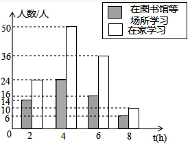 (2)①先求出在图书馆等场所学习的总人数,再求出在图书馆等场所学习4小时的人数,然后补充统计图即可;