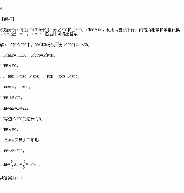 (2015秋•句容市期中)如图,等边△ABC的边长为6,∠ABC,∠ACB的角平分线交于点D,过点D作EF∥BC,交AB、CD于点E、F,则EF的长度为 .