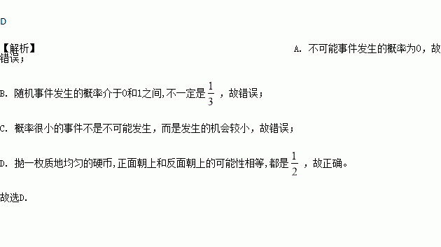 C. 概率很小的事件不可能发生 D. 掷一枚质地均匀的硬币,正面朝上的概率为![]()