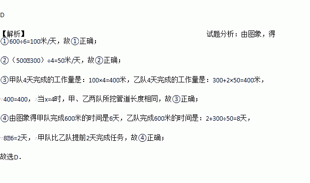 ①甲队每天挖100米; ②乙队开挖两天后,每天挖50米;