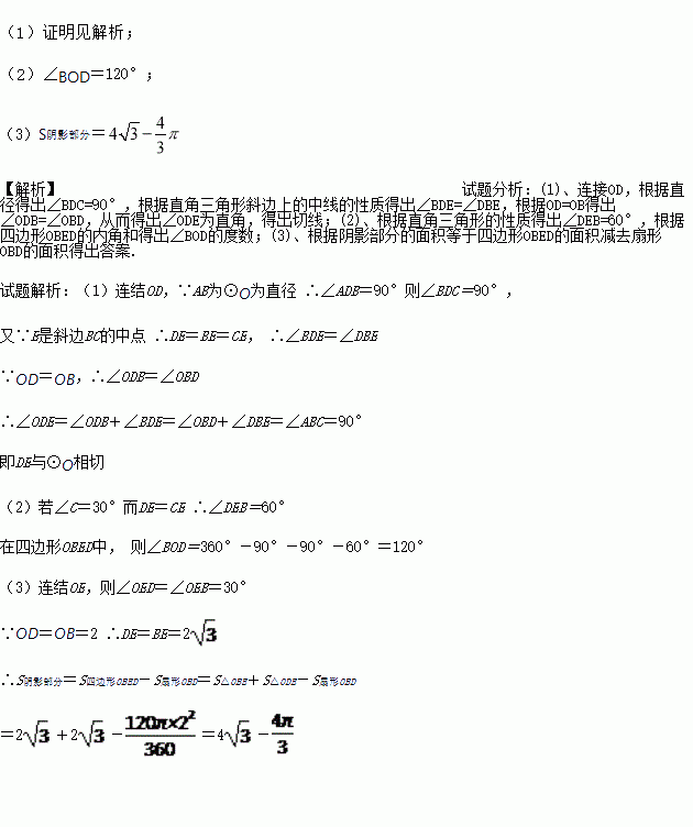 如图,Rt△ABC中,∠ABC为直角,以AB为直径作⊙O交AC于点D,点E为BC中点,连结DE,DB.