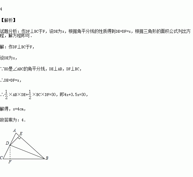 (2015秋•镇江期末)如图,BD是∠ABC的角平分线,DE⊥AB于E,△ABC的面积是30cm2,AB=8cm,BC=7cm,则DE= cm.