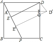 (2)首先根据相似三角形的判定方法,判断出△ABP∽△DEA,求出EA、E′A′、DE、D′E′的值是多少,进而求出三角形A′D′E′的面积是多少;然后判断出△DD′G∽△D′E′A′,△D′FG∽△D′E′A′,进而求出FG、D′F的大小,再用三角形A′D′E′的面积减去三角形FGD′的面积,求出y的值是多少,判断出y与x的函数关系,再根据AP的长度判断出x的取值范围即可.