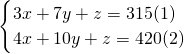 分析:等量关系为:甲3件的总价+乙7件的总价+丙1件的总价=315,4件的总价+乙10件的总价+丙1件的总价=420,把相关数值代入,都整理为等式左边为x+y+z的等式,设法消去等号右边含未知数的项,可得甲、乙、丙各5件共需的费用.