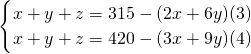 由(3)×3-(4)×2得x+y+z=105,