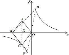 (2)分两种情况考虑:若P在第一象限反比例图象上,连接PB,PO,求出菱形的面积即为三角形PBO面积,根据BO的长,利用三角形面积公式求出P的纵坐标,代入反比例解析式即可确定出P的坐标;若P′在第三象限反比例图象上,连接OP′,BP′,同理确定出P′坐标即可.