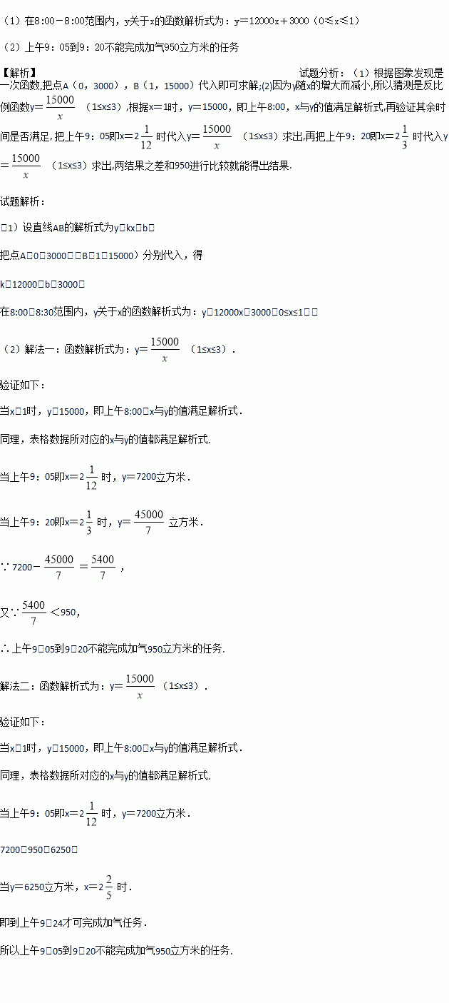 (2)在8:00-12:00 范围内,y 的变化情况如下表所示,请写出一个符合表格中数据的y 关于x 的函数解析式,依此函数解析式,判断上午9:05 到9:20 能否完成加气950 立方米的任务,并说明理由.