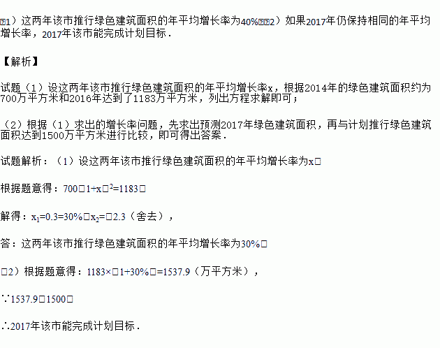 (2)2017年该市计划推行绿色建筑面积达到2400万平方米.如果2017年仍保持相同的年平均增长率,请你预测2017年该市能否完成计划目标.