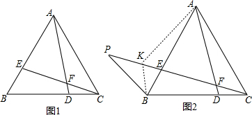 (2)在PF上取一点K使得KF=AF,连接AK、BK,求出△AFK为等边三角形,根据等边三角形的性质得出∠KAF=60°,求出∠KAB=∠FAC,根据SAS推出△ABK≌△AFC,求出∠AKB=∠AFC=120°,∠BKE=60°,根据三角形外角性质和等腰三角形判定求出PK=BK,推出FP=CK,设CP=9a,CF=2a,FP=7a,求出AF=5a,代入求出即可.