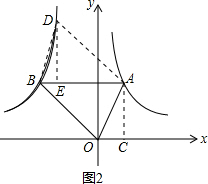 £¨3£©¼ÙÉèy2=$\frac{k}{x}$ÉÏÓÐÒ»µãD£¬Ê¹ËıßÐÎAOBDΪƽÐÐËıßÐΣ¬¹ýD×÷DE¡ÍAB£¬¹ýA×÷AC¡ÍxÖᣬÓÉËıßÐÎAOBDΪƽÐÐËıßÐΣ¬ÀûÓÃÆ½ÐÐËıßÐÎµÄ¶Ô±ßÆ½ÐÐÇÒÏàµÈ£¬ÀûÓÃAASµÃµ½Èý½ÇÐÎAOCÓëÈý½ÇÐÎDBEÈ«µÈ£¬ÀûÓÃÈ«µÈÈý½ÇÐζÔÓ¦±ßÏàµÈµÃµ½BE=OC£¬DE=AC£¬ÉèA£¨a£¬$\frac{2}{a}$£©£¨a£¾0£©£¬¼´OC=a£¬AC=$\frac{2}{a}$£¬µÃ³öDÓëB×Ý×ø±ê£¬½ø¶ø±íʾ³öDÓëBºá×ø±ê£¬Á½ºá×ø±êÖ®²îµÄ¾ø¶ÔÖµ¼´ÎªBEµÄ³¤£¬ÀûÓõÈʽ£¬¼´¿ÉÇó³ökµÄÖµ£®