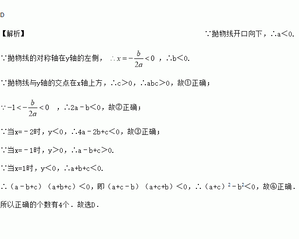 下列结论:①abc>0;②2a﹣b<0;③4a﹣2b+c<0;④(a+c)2<b2其中正确的个数有( )