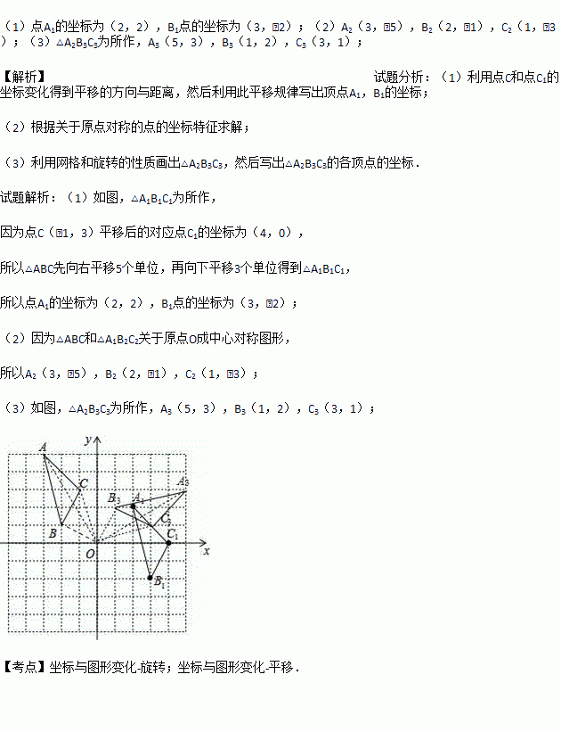 (2)若△ABC和△A2B2C2关于原点O成中心对称图形,写出△A2B2C2的各顶点的坐标;