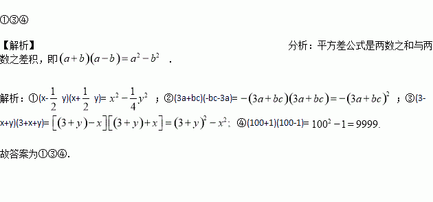 y), ②(3a+bc)(-bc-3a), ③(3-x+y)(3+x+y), ④(100+1)(100-1)中能用平方差公式计算的是________________(填序号)
