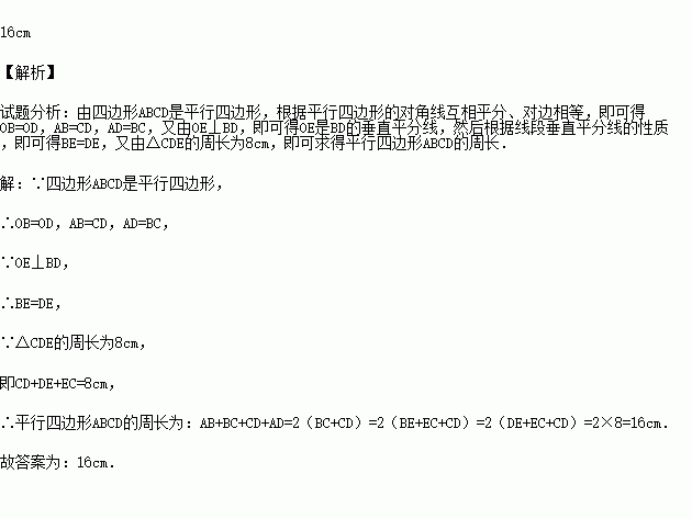 如图,平行四边形ABCD的对角线相交于点O,且AB≠AD,过O作OE⊥BD交BC于点E.若△CDE的周长为8cm,则平行四边形ABCD的周长为 .
