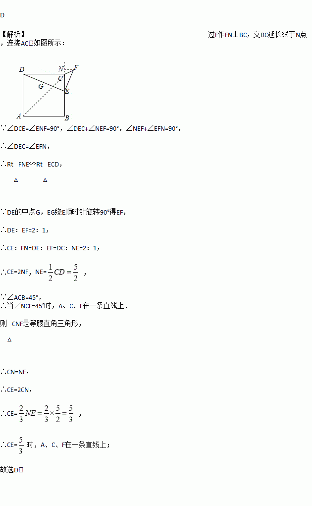 已知正方形ABCD的边长为5,E在BC边上运动,DE的中点G,EG绕E顺时针旋转90°得EF,问CE为多少时A、C、F在一条直线上 ( )