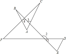 分析:首先根据邻补角的性质可得∠2的度数,再根据三角形内角和外角的性质可得∠A+∠B=∠3,∠3+∠C=∠4,∠F+∠4=∠2,∠D+∠E=∠2,进而可得答案.