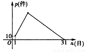3月份,某品牌衬衣正式上市销售,3 月1日的销售量为10件,3月2日的销售量为35件,以后每天的销售量比前一天多25件,直到日销售量达到最大后,销售量开始逐日下降,至此,每天的销售量比前一天少15件,直到3月31日销售量为0,设该品牌衬衣的日销量为p(件),销售日期为n(日),p与n之间的关系如图所示。