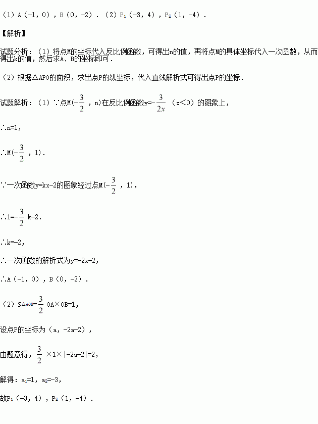 (2)设点P是一次函数y=kx-2图象上的一点,且满足△APO的面积是△ABO的面积的2倍,请直接写出点P的坐标.