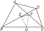 分析 设BC中点为G,连接EG、FG. 由中位线的性质得EG=$\frac{1}{2}$DC,FG=$\frac{1}{2}$AB,再根据三角形的三边关系可得EF<EG+FG,再利用等量代换可得EF<$\frac{1}{2}$(AB+CD).